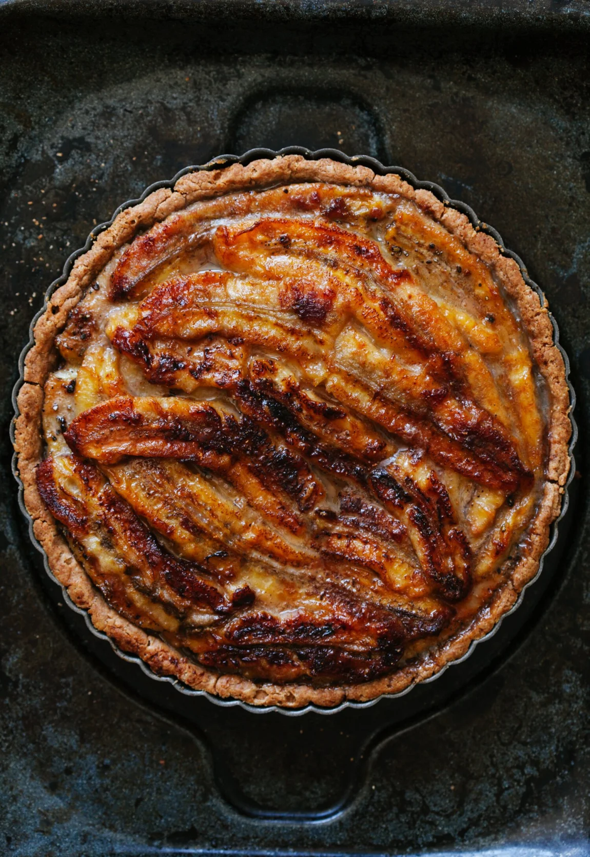 - Bake for 30-40 minutes, until the crust is golden and bananas are caramelized. Let cool before slicing.