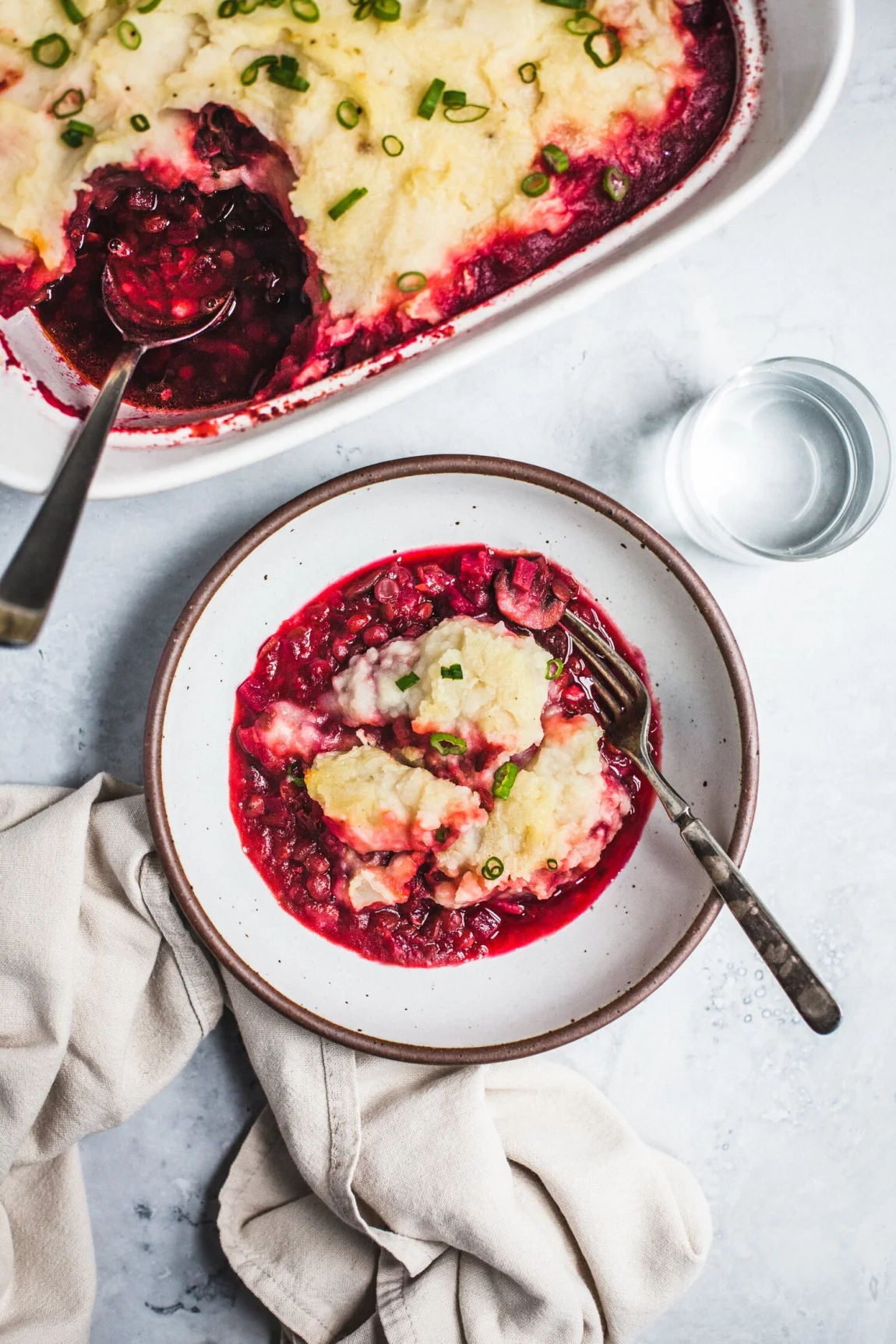 Beet Shepherd’s Pie with Balsamic, Lentils, and Mushrooms