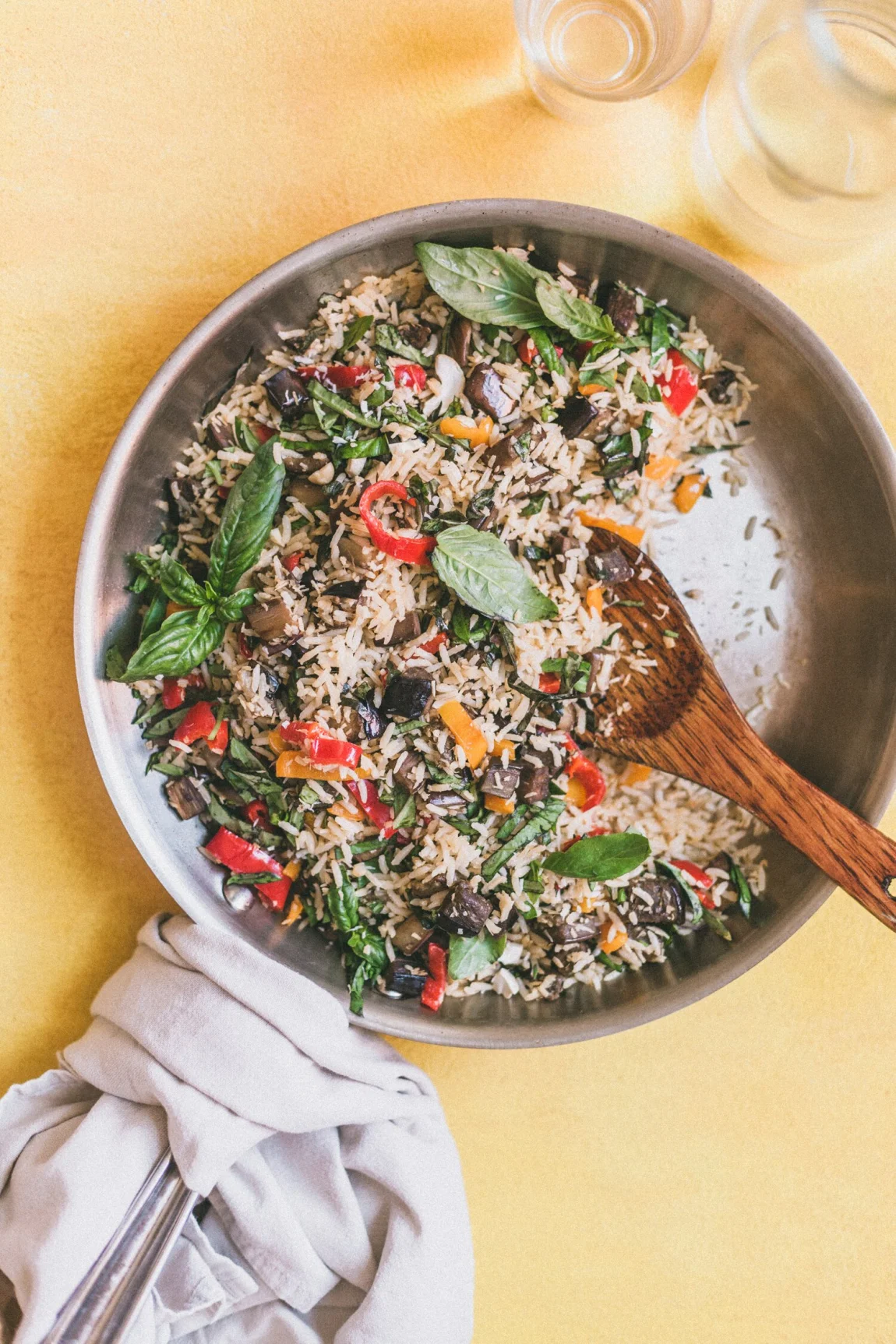 The preparation here is quite simple. Eggplant is cooked first and separately from all the other components of the dish, because that’s how it tastes its best in my experience. After that, all the ingredients are added to the same pan in stages, building up the flavor from the bottom up. What makes the flavors pop here is the addition of a quick, ginger-lime sauce, as well as a few tablespoons of desiccated coconut, which gets nice and toasty together with the rice. Don’t be afraid of adding tons of basil here, too. It does such a great job of elevating the whole dish with its brightness. Hope you enjoy this one!