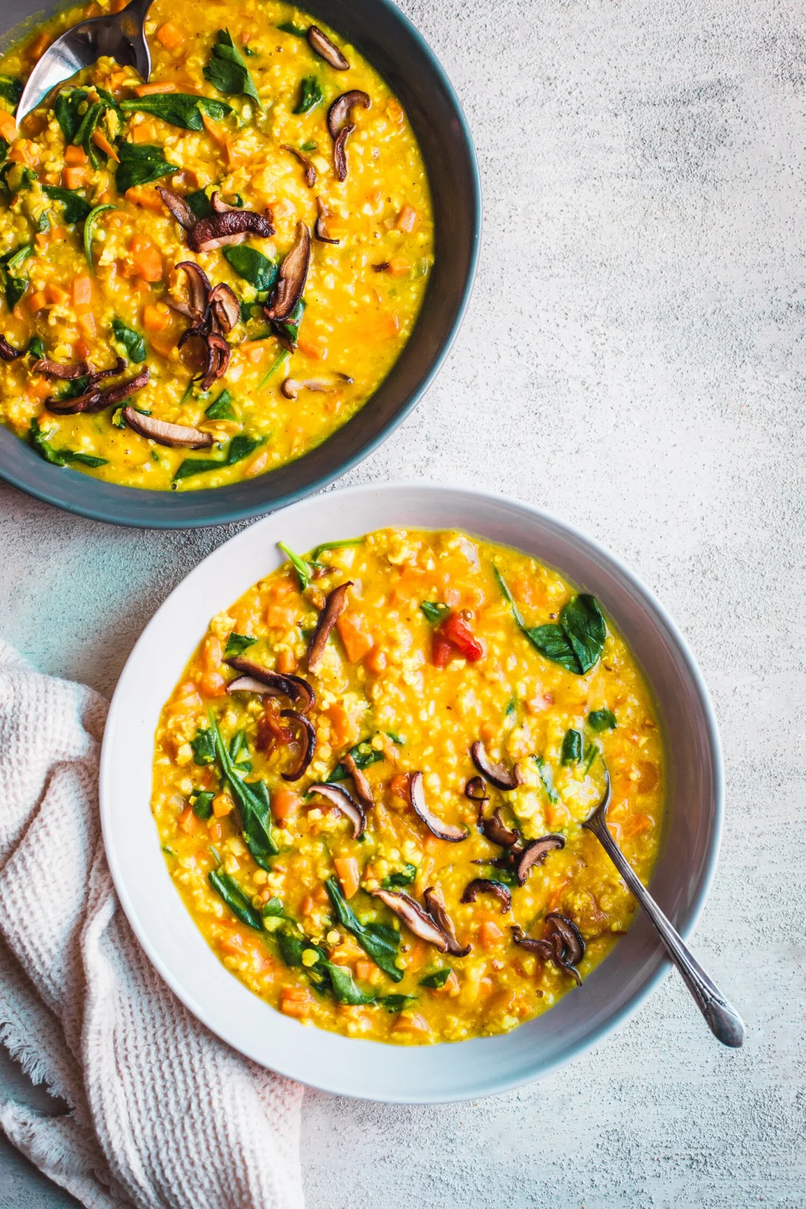 - Once the soup is done, turn off the heat and taste for salt and pepper, adjusting if needed. Wilt in the spinach, as much as you like. Stir in the lemon juice. Serve hot, garnished with any preferred garnishes: herbs, yogurt, pesto, or pan-fried mushrooms as pictured. Enjoy!
