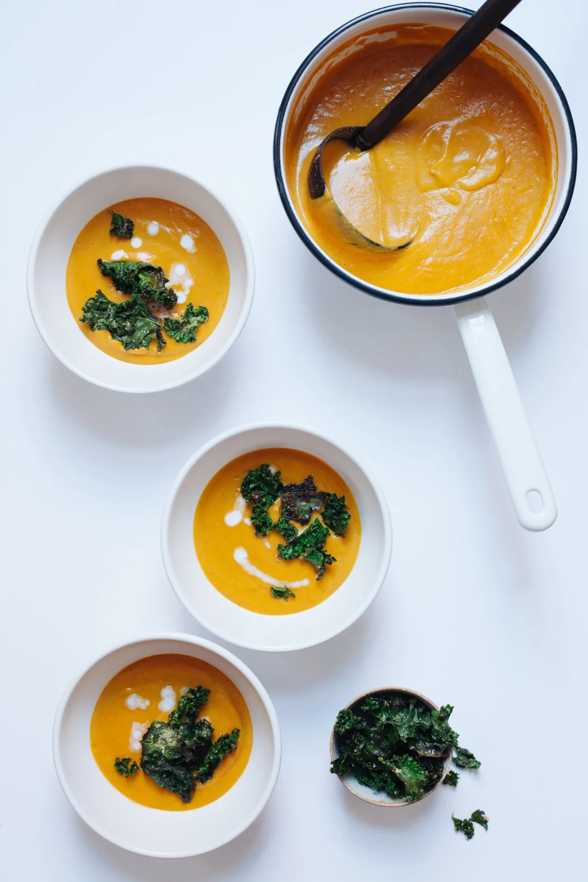 - Transfer soup to a blender and puree, seasoning with salt and pepper. You might have to do this in batches, depending on the size of your blender. Serve garnished with reserved coconut milk (optional) and crispy kale (recipe below).
