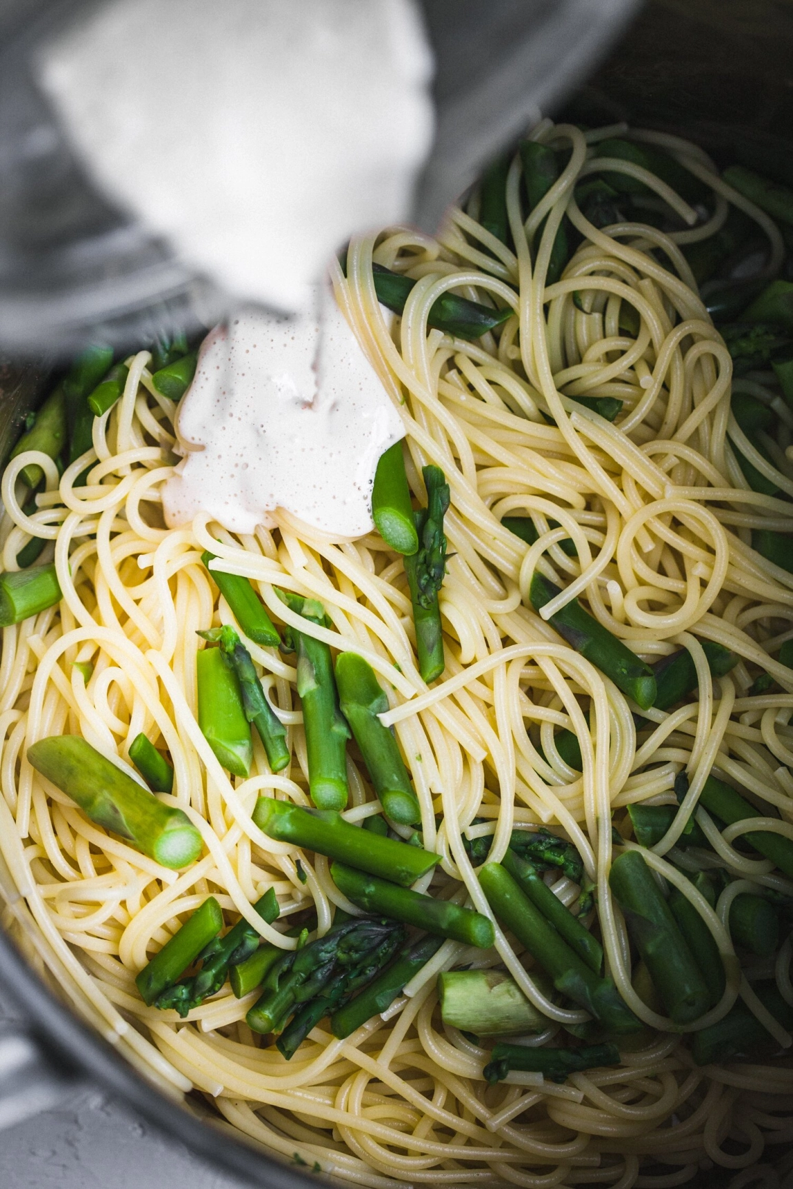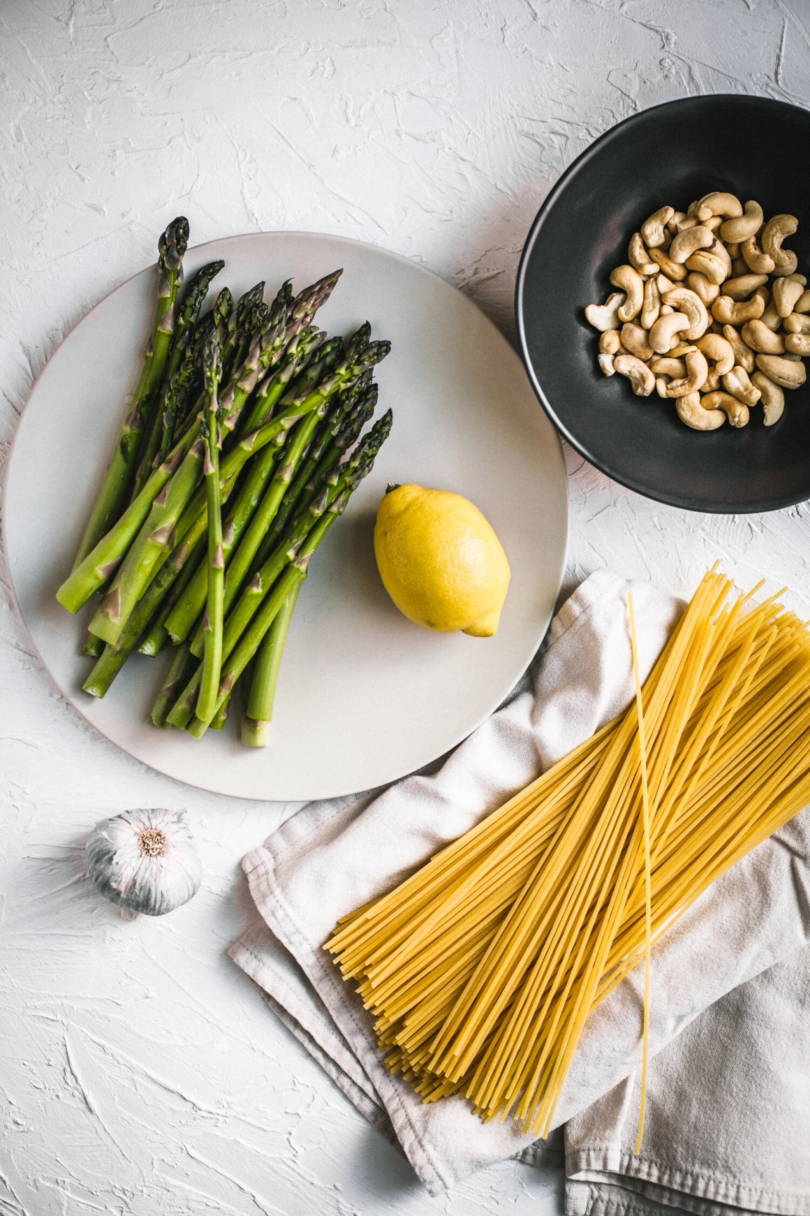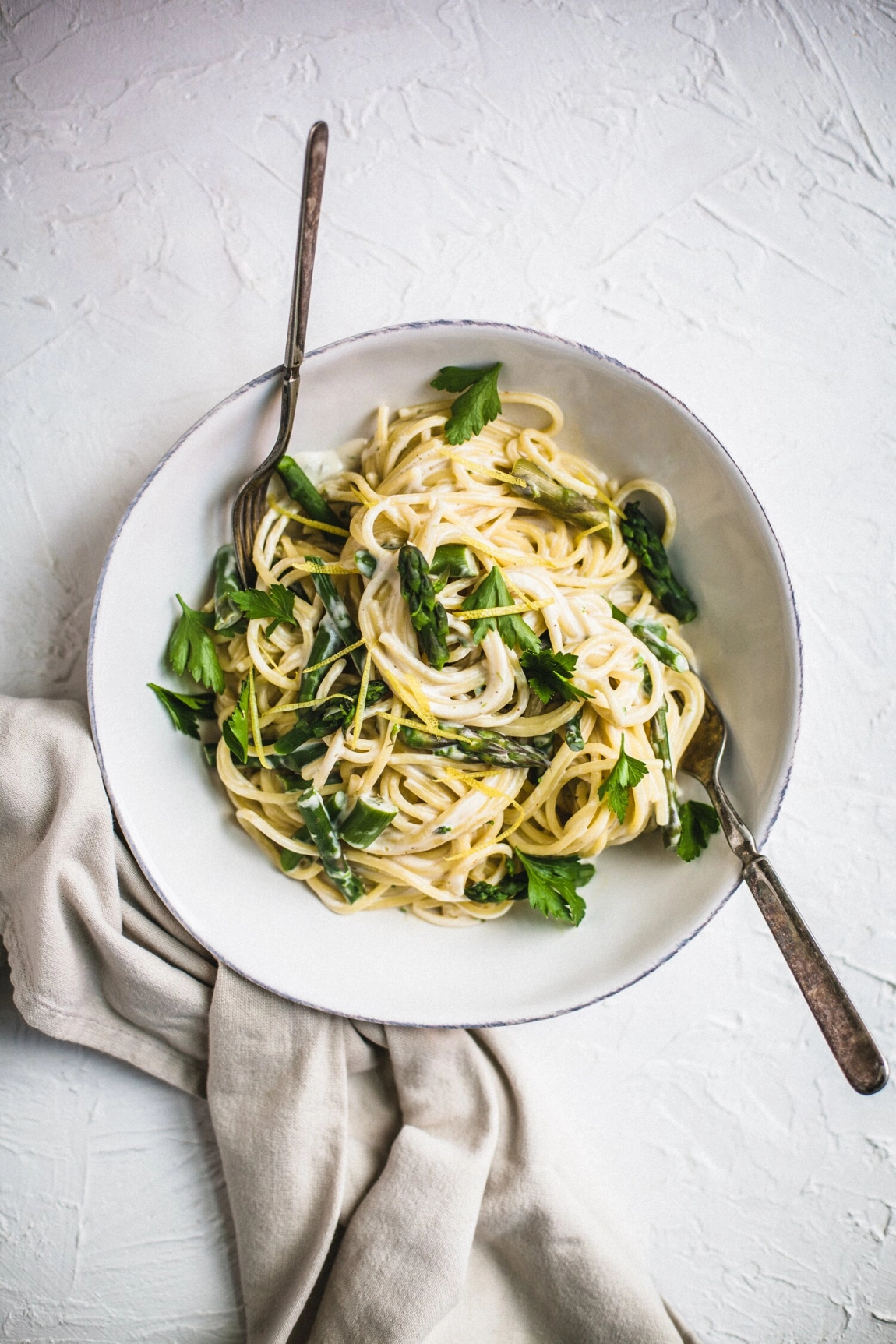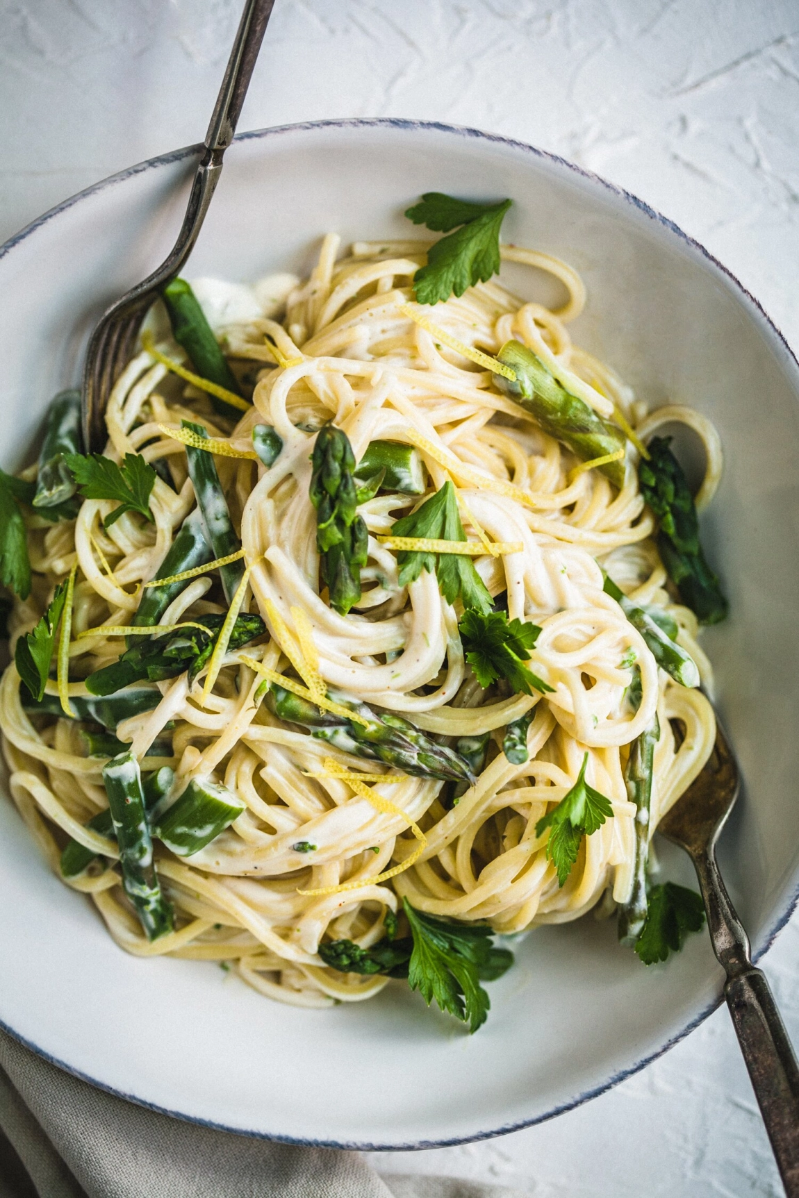 - Cook the pasta in the prepared pot until al dente, according to the time on the package. Add the asparagus to the pot at the last 3 minutes of cooking the pasta, to blanch. Reserve 1½ cups of the starchy pasta water before draining the pasta. Drain the asparagus and pasta and return both to the pot. Pour the cashew sauce over the pasta, along with a generous splash of the reserved pasta water, mix well to combine. Add more pasta water as needed, until you have a nice saucy consistency. Serve right away, garnished with the reserved lemon zest and herbs, if using.