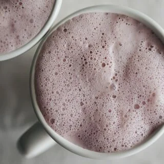 Hibiscus is a powerful tropical flower with a long list of health benefits (anti-inflammatory, digestive aid, metabolism-boosting, helps with cholesterol level and blood pressure maintenance). It also happens to produce the most brilliant, ruby red-colored tea with a prominent tart flavor. I’ve always found pure hibiscus tea to be a little too sour for my taste, but came up with this latte in a recent attempt to get more of its stunning color into my morning routine, and now I’m completely hooked. The creaminess of the almond milk helps offset the harshness of the hibiscus, and the ginger adds a nice note of warmth and complexity, making this latte a great winter drink. The green tea is optional here, but a great addition when you need a little help waking up in the morning or as a mid-afternoon boost. And I swear I feel like I’m getting color therapy when drinking this latte – the fluffy, pink foam is so soothing to look at, I’m in a complete state of peace by the time I’ve taken my last sip.