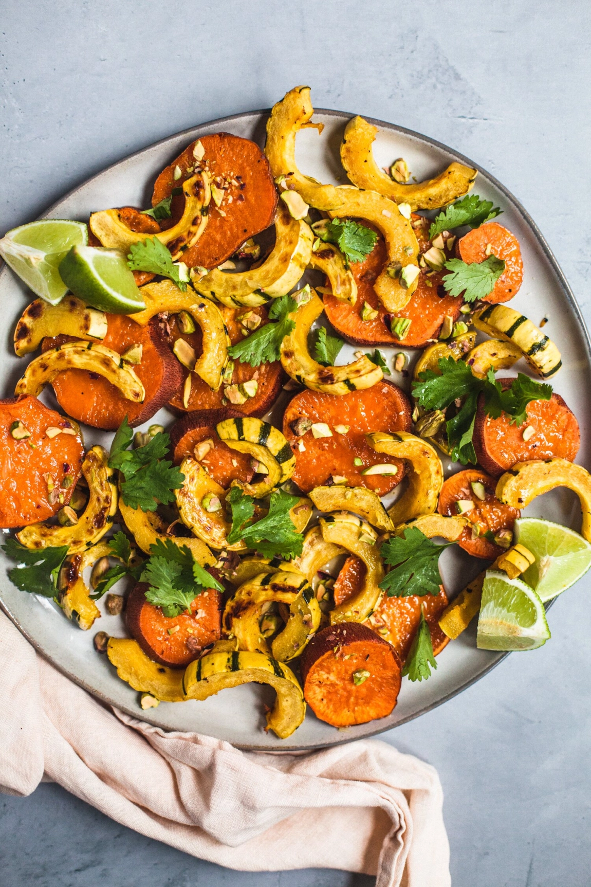 Hi friends! If you’re in need of one more super simple but stunning veggie dish for your holiday table, we’ve got you. Squash and sweet potatoes are typically paired with rich, earthy ingredients like sage, nuts, butter, etc. during the holiday season. That’s always a winning combination, but we also love this fresh and vibrant take on preparing the starchy fall vegetables. We roast delicata squash half-moons and sweet potato rounds until tender, then drizzle them with lime juice and tamari, and shower everything with pistachios and cilantro. The brightness of the lime cuts right through the dense and grounding nature of the squash and potatoes, making for the most heavenly flavor combination. Some crunch from pistachios, and a green, herbal hit from cilantro (always so good with lime) perfectly complete the dish. This one definitely looks and tastes like it took much more time and effort than it actually requires.