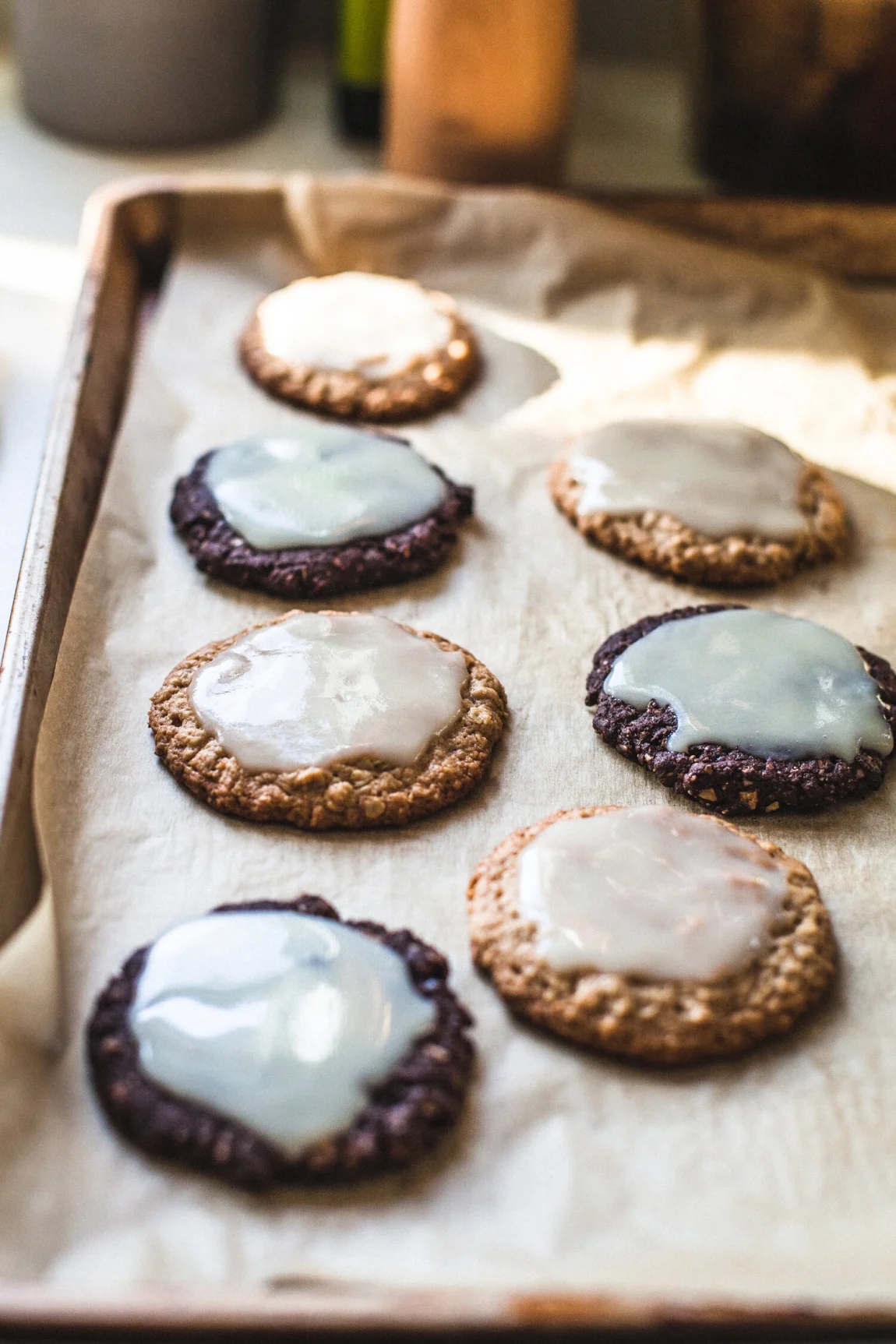 - Using a small (1½″) ice-cream scooper or 1 heaping tablespoon measure, scoop one cookie at a time and arrange on the baking sheet 2″ apart. Flatten the cookies out with the back of a spoon if needed (this will depend on the creaminess of your tahini). Bake for 12-15 minutes, until the edges are slightly golden brown. 12 minutes will give you a chewier cookie, while 15 minutes will make for a harder cookie. Let cool completely to firm up. Glaze with the coconut maple glaze (recipe below) and enjoy.