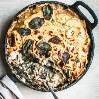 Happy October! Today we’ve got the coziest recipe for ushering in the first full month of fall – a cauliflower bake from Amy Chaplin’s beautiful new cookbook, Whole Food Cooking Every Day. This recipe has everything we ever want in a comforting, fall dish: mushrooms, caramelized onions, chickpeas, and hearty greens, all covered by a fluffy, almost cheesy blanket of vegan cauliflower souffle.