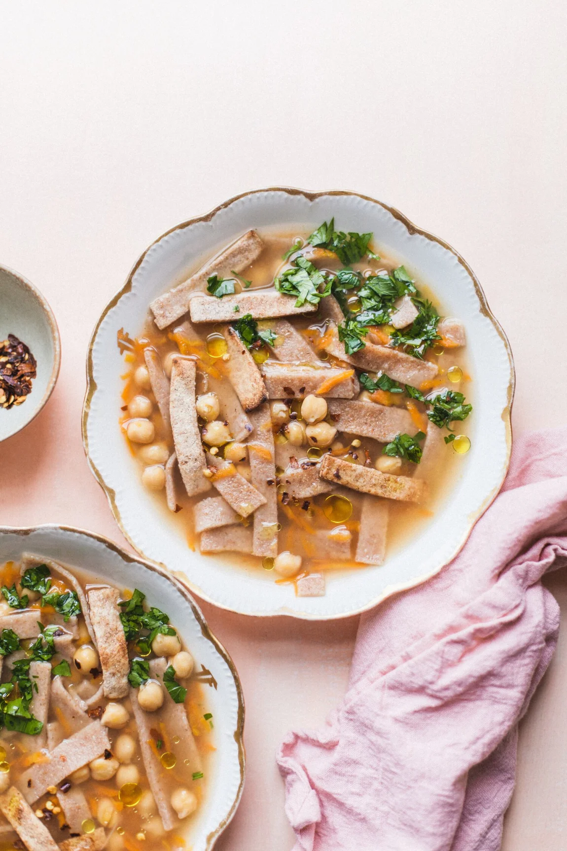 This is a great time to say that you can totally use store-bought pasta here! The eggless sagne pasta is easy to make, but it’s still much more of a project than just opening up a package and being ready to go (just skip the crispy pasta element). If you’re ever craving something resembling chicken soup from your childhood, this is a great, vegan version that still hits all of those comfort notes. Enjoy!