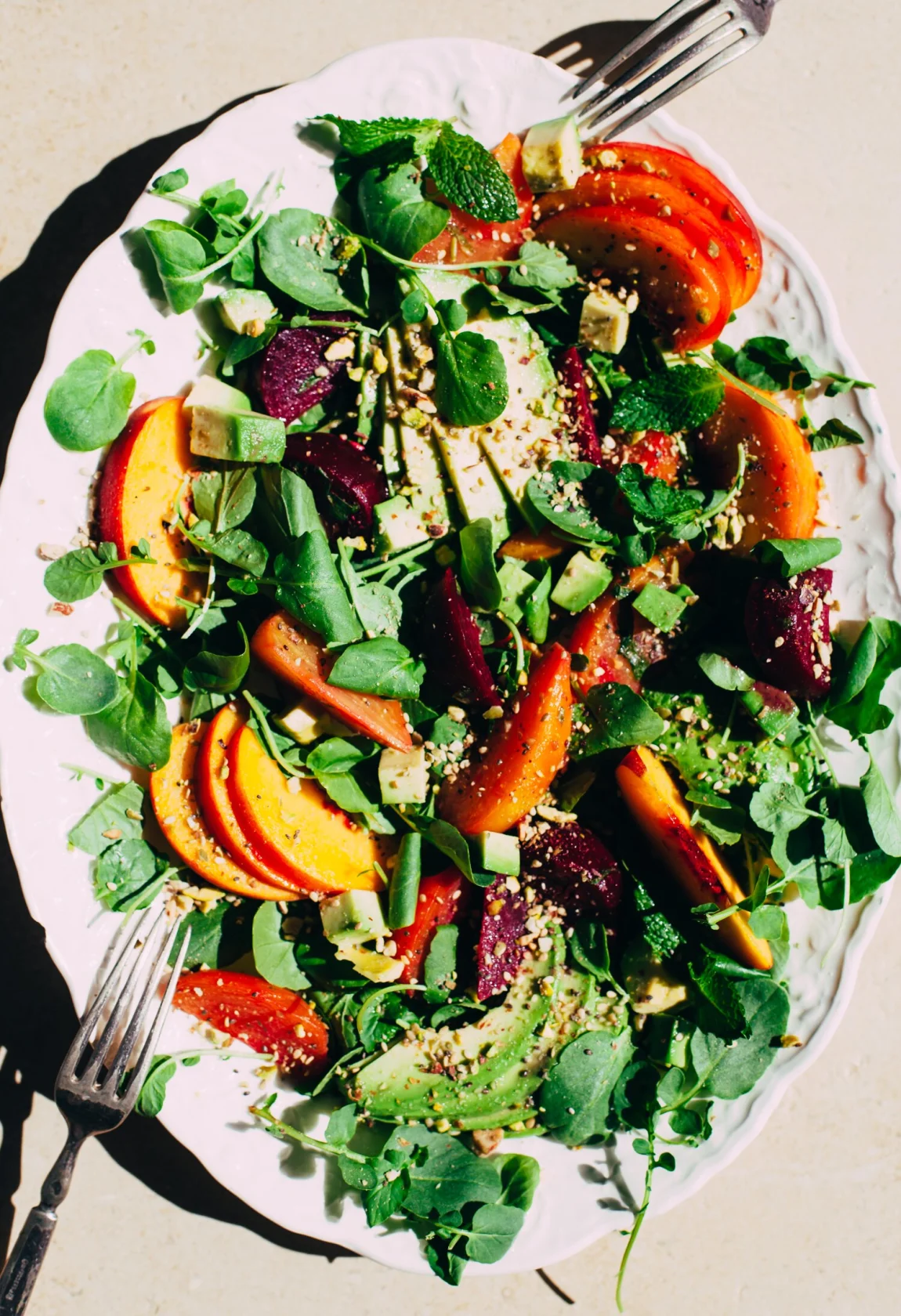- Divide the watercress between plates, arrange the beets, peaches and avocado on top. Drizzle the salads with the mint vinaigrette and sprinkle with the dukkah. Garnish with more mint leaves, if using.