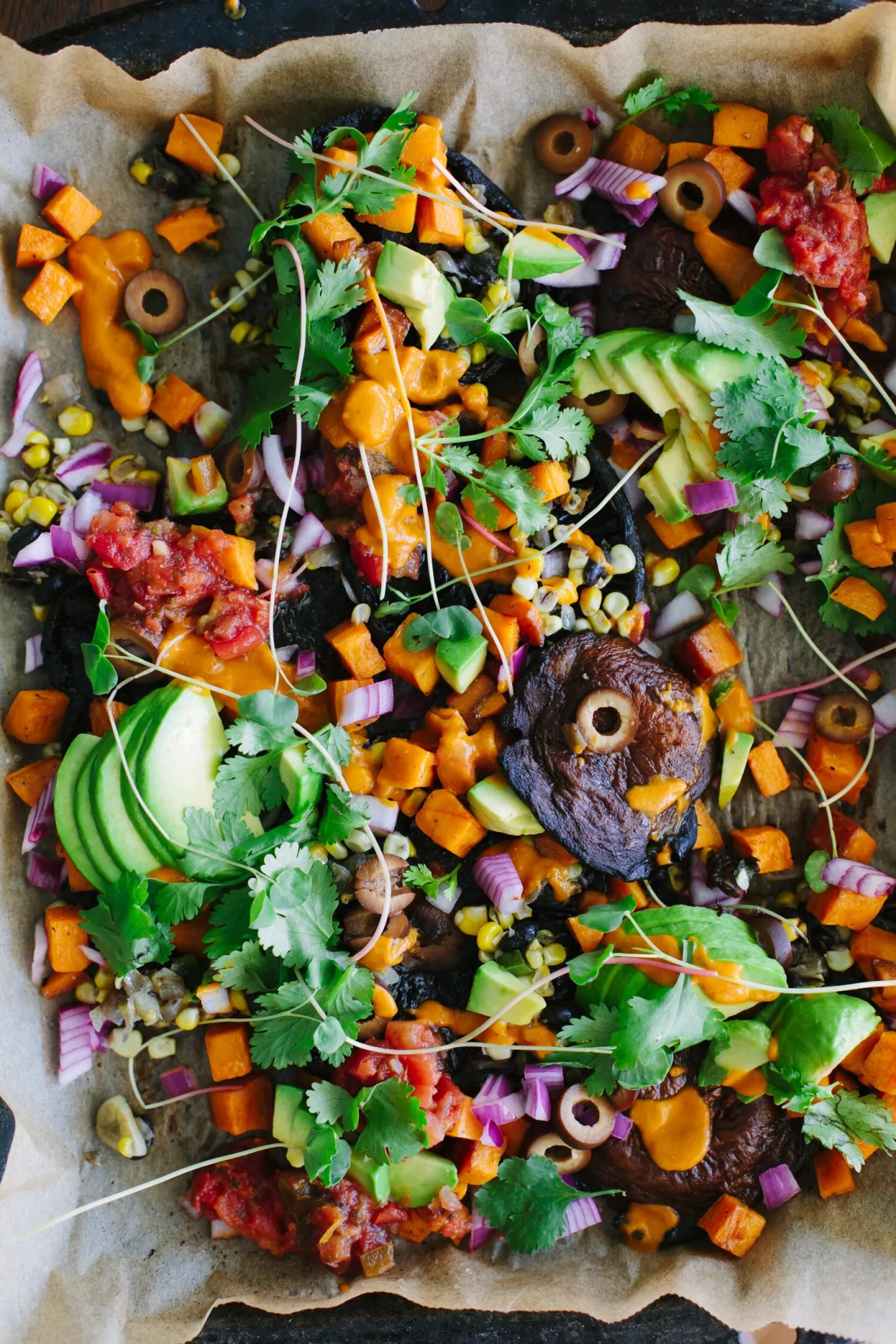 - To assemble, arrange the portobellos caps on a tray or a platter, top with the corn and bean sauté, sweet potato cubes, the remaining avocado (sliced), olives, if using, and red onion. Drizzle with the sauce and spoon in some more salsa to taste, top with cilantro and microgreens, if using. Squeeze more lime juice over the nachos and serve.