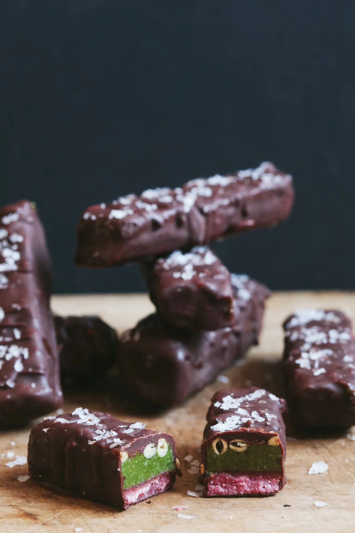 The bottom, ‘shortbread’ layer is made with coconut flour and colored pink with beet powder, which is totally optional, but contributes to the bars’ stunning appearance (and nutrition!). No baking required there. The green ‘caramel’ layer is made with sweetened, homemade pumpkinseed butter, but you can pretty much use any nut or seed butter in its place. Everything is covered with chocolate and generously sprinkled with flaky salt. So good! The recipe looks long because I give directions for making your own seed butter and chocolate coating, but those two can easily be store-bought for a quicker prep time. We made a step-by-step video to show the fun of the process, too :)