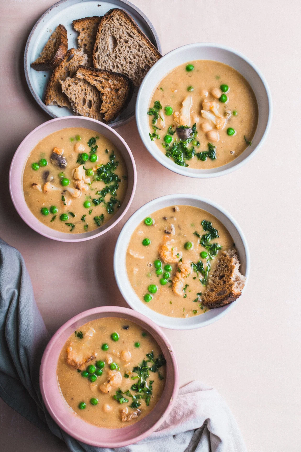 - Once the chickpeas are cooked and the vegetables are roasted, add the cauliflower and mushrooms to the pot with the chickpeas, stirring to combine. Add about half of the soup to an upright blender, making sure to catch plenty of chickpeas, cauliflower, and mushrooms for creaminess. Blend until smooth and return the blended liquid to the soup pot, mixing everything together. Bring the soup back up to a boil and simmer for 5 more minutes for the flavors to merge. Turn off the heat and stir in the peas, which will thaw immediately in the hot soup. Stir in the lemon juice. Taste for salt and pepper and adjust if needed. Serve the chowder, garnished with fresh herbs, a drizzle of sesame oil or olive oil, and with a side of toasted sourdough bread or croutons. Enjoy!