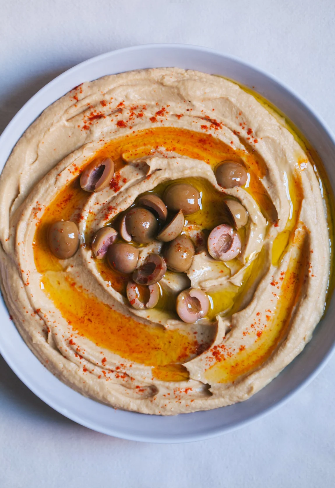 - Serve the hummus garnished with more olive oil and olives, if using. Keep refrigerated in an air-tight container.