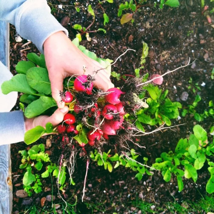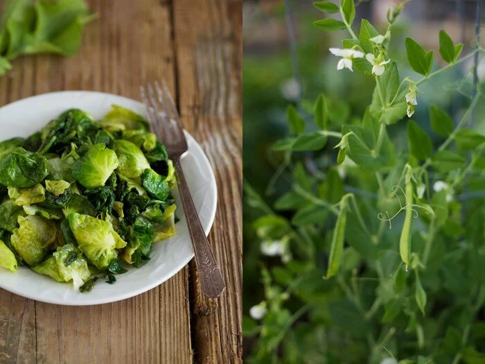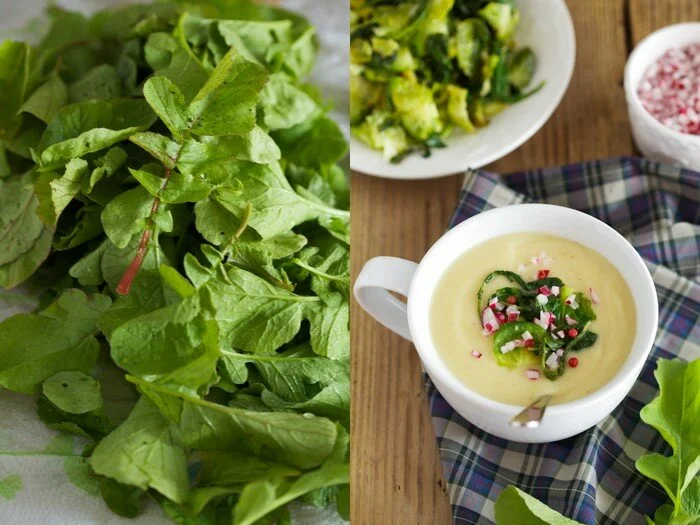 But most abundant are radishes, all kinds of them. They take very little time to grow and are practically maintenance free. Every visit to the garden results in a nice bunch of fresh, bright radishes. Their leafy tops are so rich and green, that I’ve had a hard time tossing them. One of my fellow gardeners mentioned that some cultures grow radishes for their tops specifically, while feeding the bulbs to animals. I was intrigued and decided to give radish greens a try, sauteing them with Brussels sprout leaves until barely wilted. They contributed a slight bitterness and definite freshness to the dish. I’ve seen many other interesting recipes online, where radish greens are sauteed with onions or added to soups. Please let us know if you’ve had any tasty experience with them, we’d love to hear.