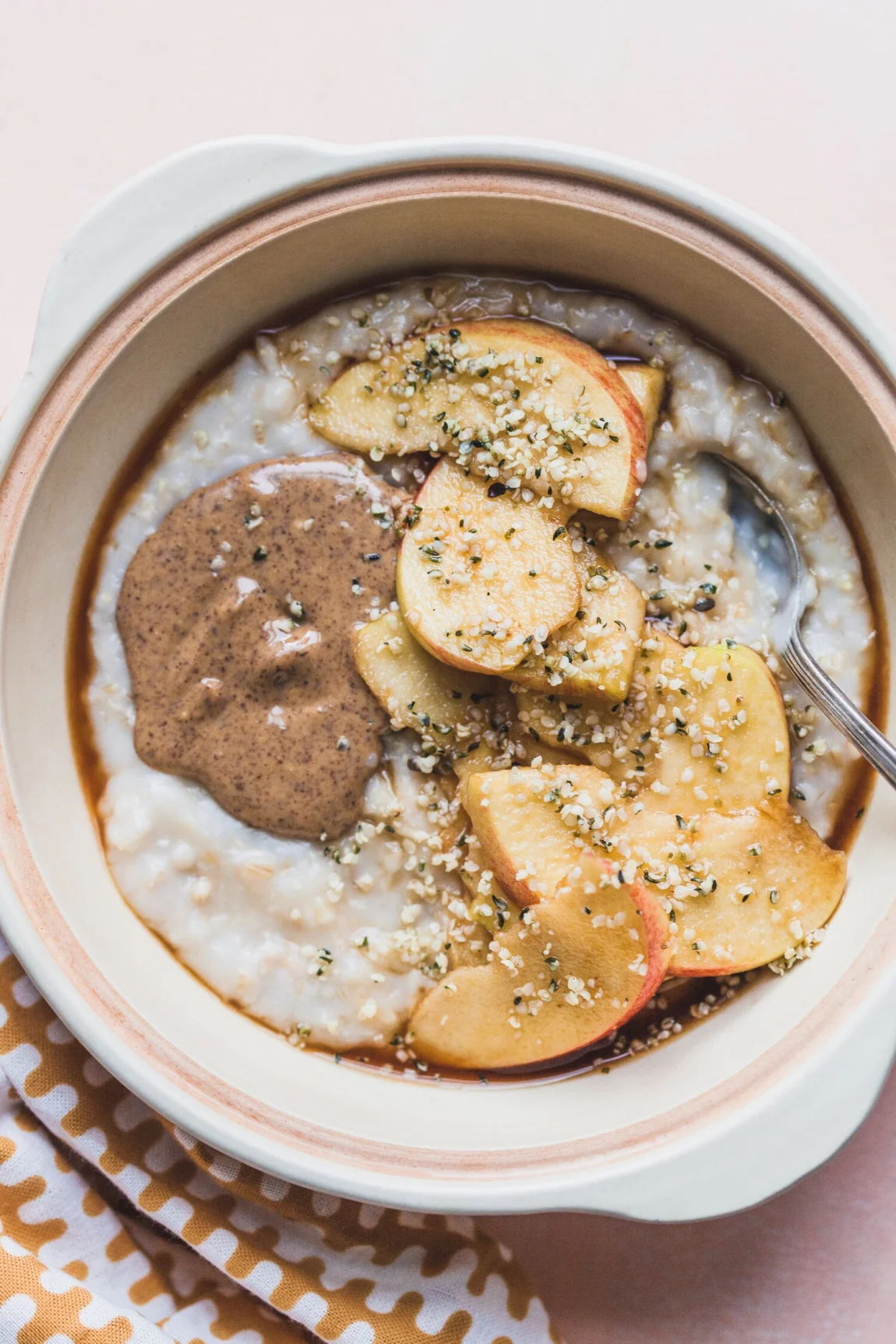 3Reheat the oats with the grated apple over medium high heat, mixing regularly. If the oats seem too watery, cook them for about 5 minutes, and they'll thicken up. On the other hand, if you'd like the oats to be more creamy, reheat them with a splash of plant milk or water for a creamier consistency. Serve, topped with sliced apple, hemp heart or other nuts/seeds, and almond butter.