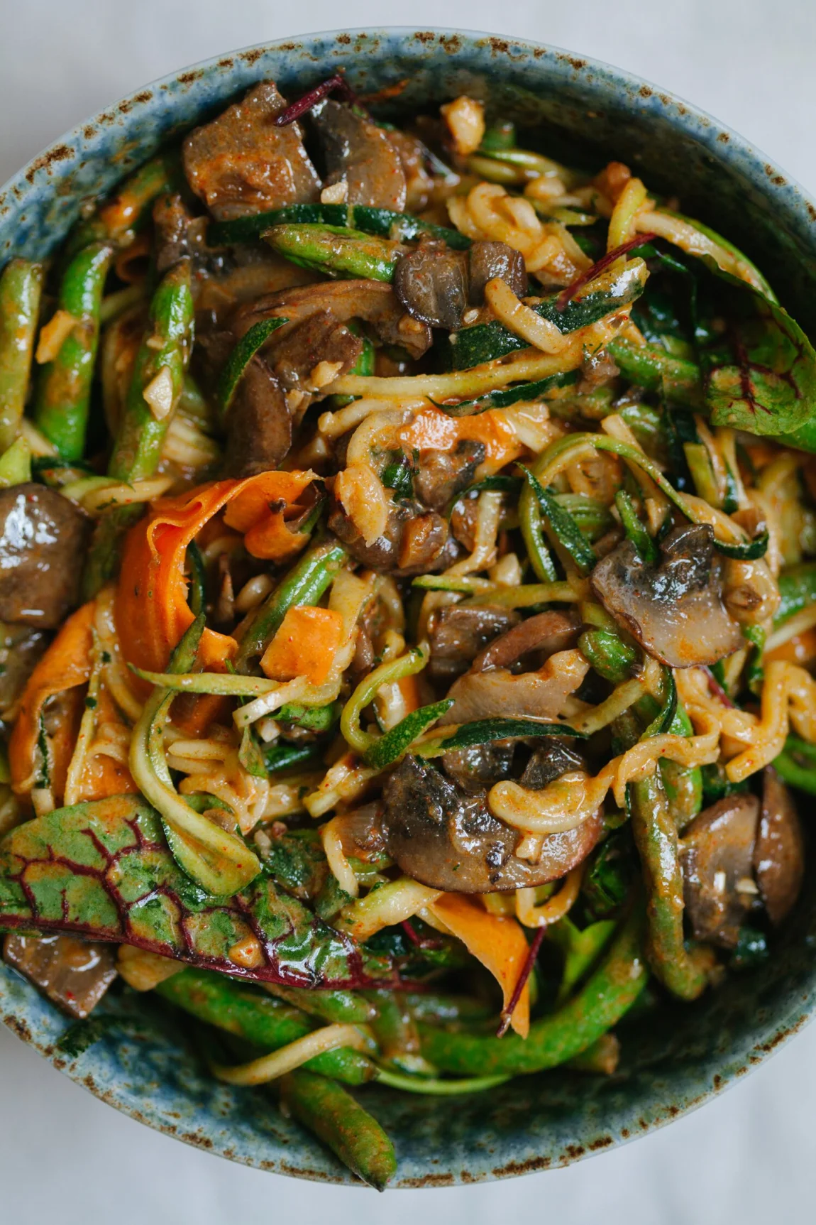 This is a simple plate of tangled summer vegetables – tender zucchini noodles and carrot ribbons, gently blistered green beans and shallot-kissed mushrooms, all dressed up in a bright, smoky sauce. We’ve been eating it this week, first as a salad on its own, then as a side dish, and the leftovers made their way on top of hearty sourdough toast – all equally delicious and so fresh.