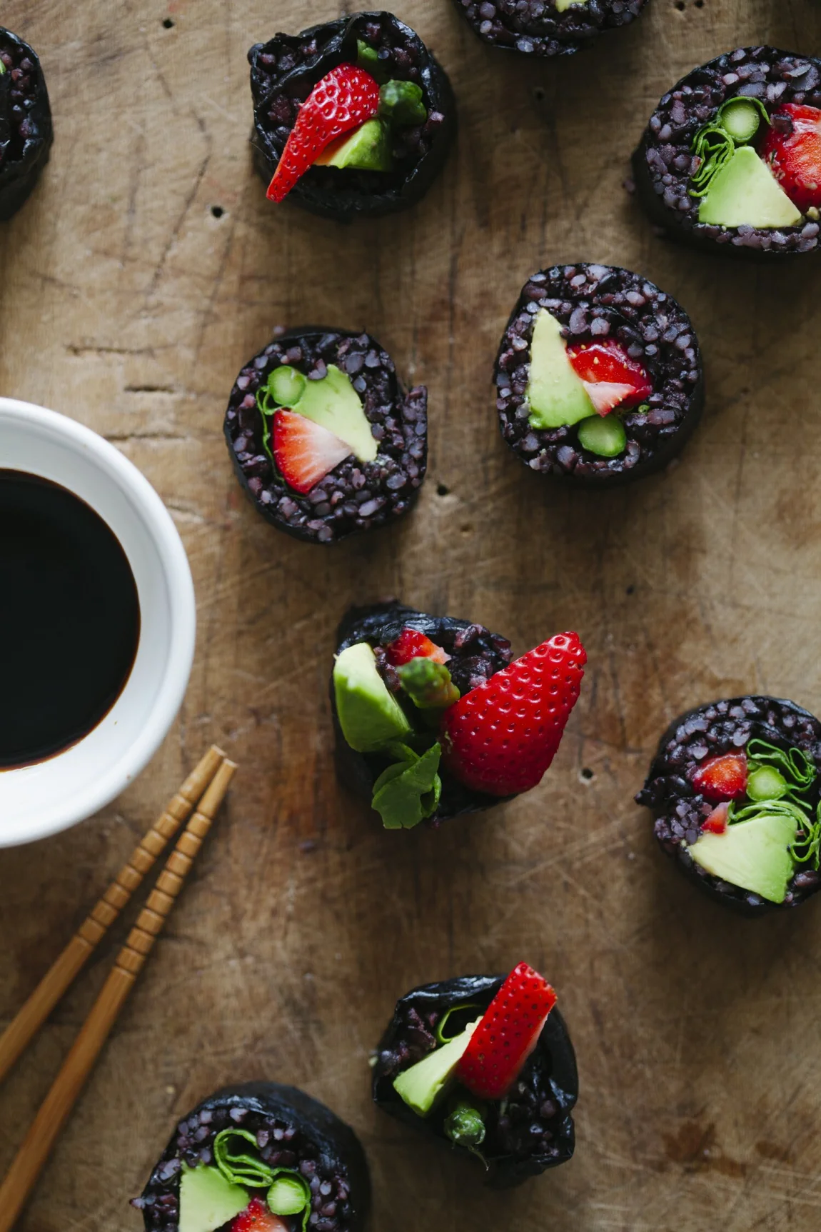 For the adults and the less picky, these sushi rolls have it all. They are summery, light and bright, a great small meal or snack for the sunny days ahead. I used black rice, one of my favorite grains out there, for a little more bite and nutrition. There are sweet summer strawberries, tender, crisp asparagus, and spinach for that extra green. Avocado is always a great finishing touch to any vegetable sushi, its buttery texture just goes so well with rice and slightly crunchy nori.