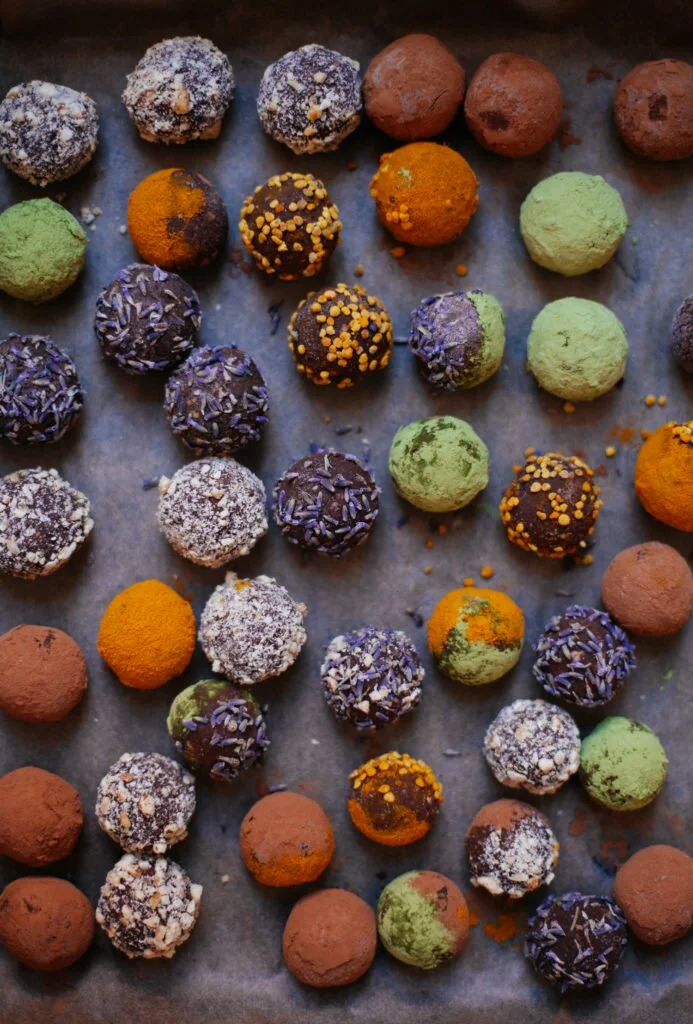 Deciding on the natural superfood sprinkles is fun, and the possibilities here are endless. Paloma pointed out that, once coated, these truffles looked like various planets she’s been learning about, so that’s the origin of the cosmic name. She had fun assigning planet names to each particular coating and color – if I remember correctly, matcha was for Earth, while lavender represented Venus, turmeric – Mars, and so on. Enjoy!