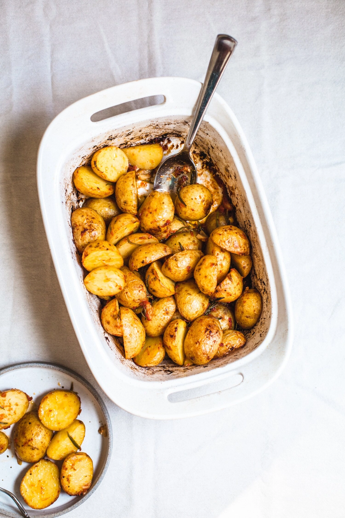 We have a recipe for lemon miso roasted potatoes that’s a huge crowd pleaser and very much worth the little bit of extra effort it requires. Today’s recipe employs a similar technique of roasting potatoes in a number of flavorful ingredients, more su