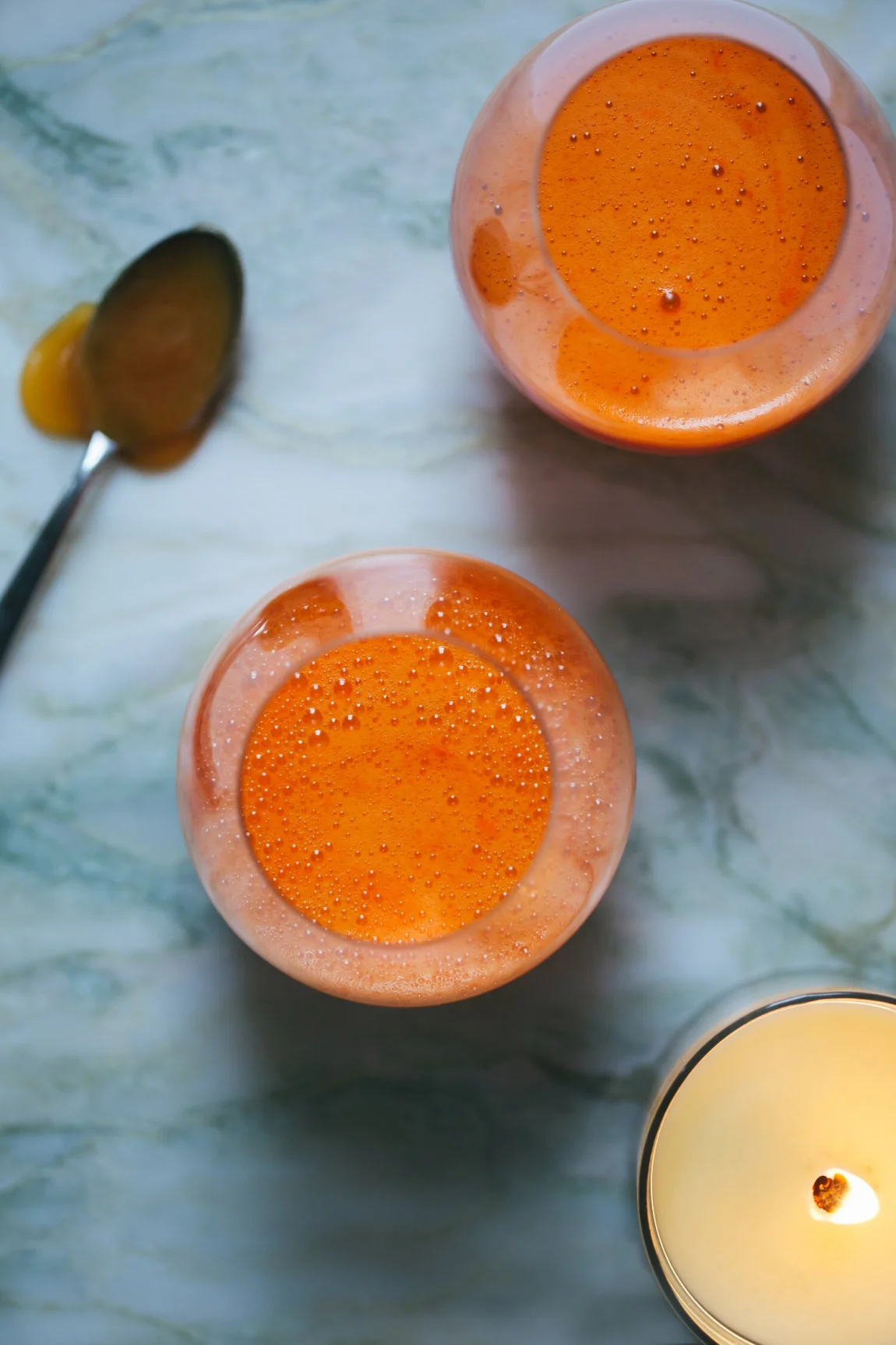 So here’s the carrot-based tonic I’ve been inspired to drink more often. Since I don’t love pure carrot juice, I doctor it up with ginger, turmeric, lemon and honey, which makes it a true remedy and a preventative for winter colds and flu. It’s delicious – potent, refreshing, spicy and sinus-clearing, and a little goes a long way – I like having a shot or a small glass at a time.