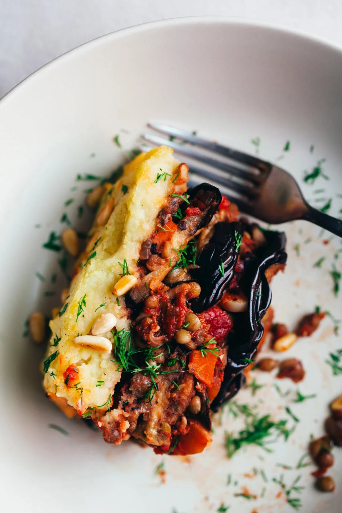 - Arrange half of the eggplant slices on the bottom of a 9" x 9" baking dish or a dish of a similar size. Top with half of the lentil mixture, followed by the remaining eggplant slices and lentils. Spoon the mashed potatoes on top, evening them out with a spoon into a smooth layer. Brush more olive oil over the potato layer and place the dish in the oven. Bake for 30 minutes. Remove from the oven, sprinkle with the pine nuts and herbs, if using, and serve.