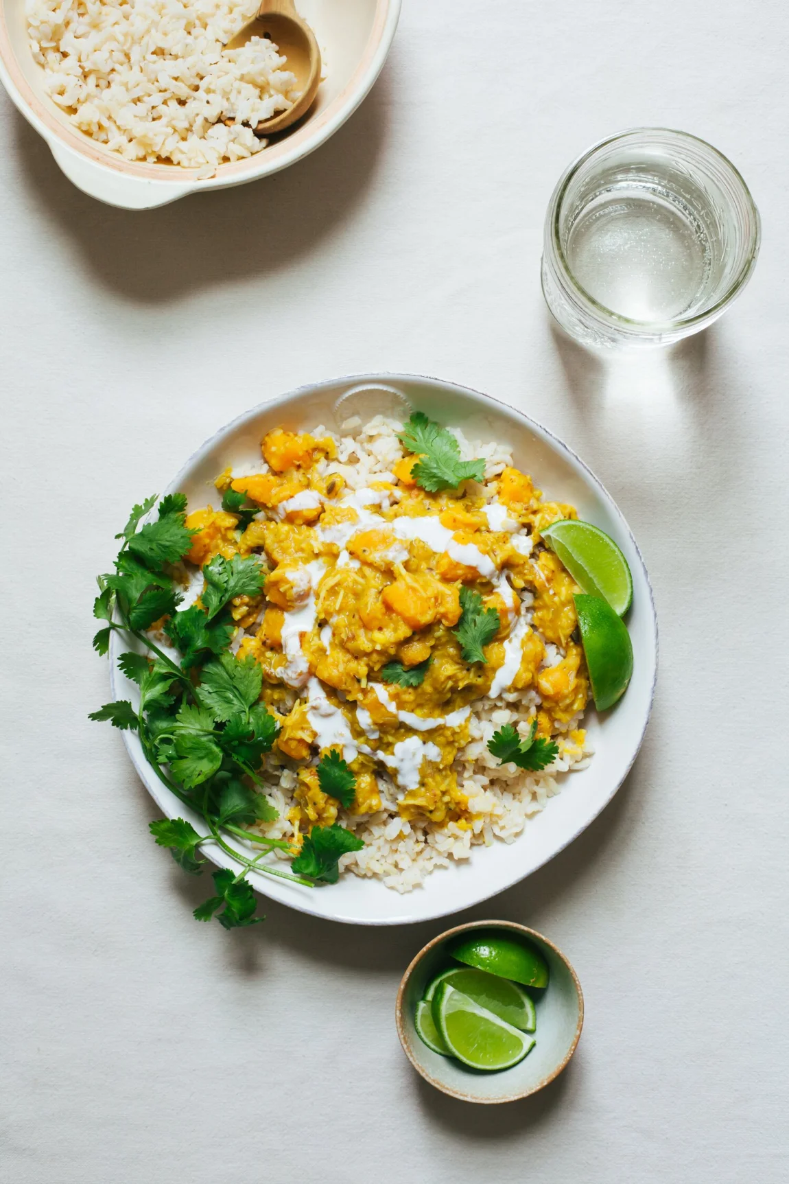 When looking for inspiration for balanced winter weeknight meals, I often turn to South Indian cuisine for its array of delicious vegetarian dishes and Ayurveda-approved ingredients. This particular stew is based on a recipe for sambar – a mung dal (yellow split mung beans that are protein-rich and affordable) stew that comes in hundreds of variations. The base for sambar is most commonly made up of mung dal that’s been cooked down to a porridge-like consistency and spiced, after which almost anything goes. You can include one or many stew-friendly vegetables in season, as well as other fun add ins like desiccated coconut. I love the versatility of this dish and usually just add in whatever vegetables or greens I have on hand. For this version, I kept things simple and only added chopped butternut squash and dried coconut – it can be as simple or as involved as you’d like.