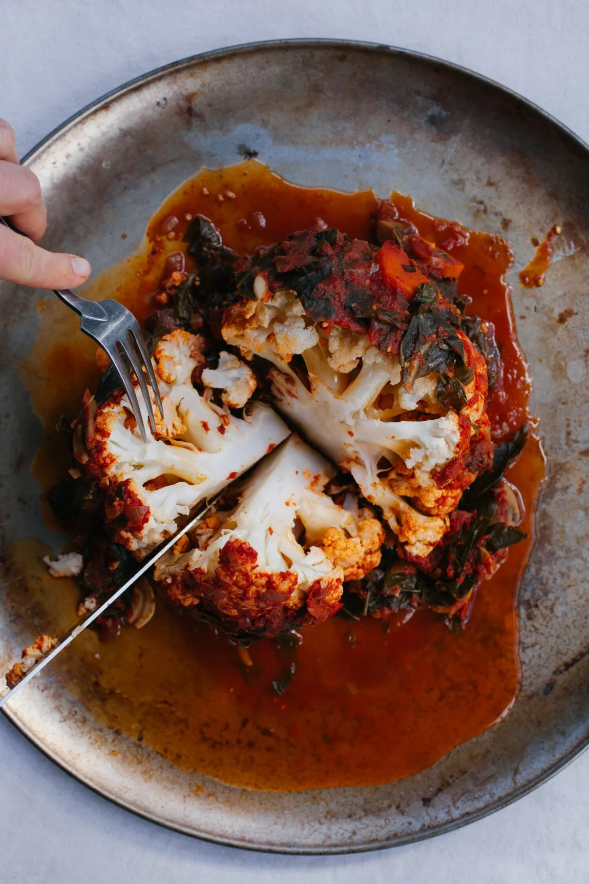 The holidays can be a little tough if you are trying to stay on track with eating well or even simply keeping away from meat/dairy/gluten. If you aren’t participating in one or more of those categories, chances are, you might feel excluded at a holiday table. And even if you are totally fine with eating those veg-centered sides only, others might find it offensive or feel as though they are not being good hosts, etc. The point is, there is usually a main event to a holiday table, and although to me it’s always been the pie, to most it’s the bird, or another grand platter of some sort of meat. There is a ceremony to getting that platter on the table – it takes time and care to pick out and prepare, which creates anticipation and excitement. Here, I applied that kind of thinking to cauliflower, a whole cauliflower, prepared in a way that feels ritualistic, celebratory and fun, and delicious enough to be a holiday table centerpiece.
